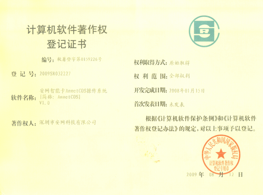 安網智能卡AnnetCOS操作(zuò)系統(簡稱:AnnetCOS)于2009年8月12日成功獲得(de)國家(jiā)版權局頒發的安網智能卡AnnetCOS操作(zuò)系統軟件著作(zuò)權證書(shū)。根據《中華人(rén)民共和(hé)國著作(zuò)權法》、《計(jì)算(suàn)機軟件保護條例》的規定,已經取得(de)軟件著作(zuò)權登記證書(shū)的軟件受到國家(jiā)法律的重點保護。